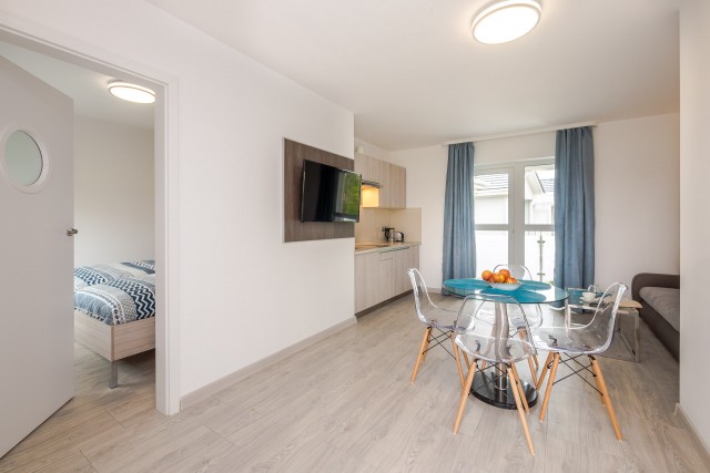 W tym kontekście warto zwrócić uwagę na Srebrną Wydmę Resort w Dąbkach — nowoczesny obiekt stworzony z myślą o różnych formach wypoczynku, w tym pobytach grupowych. Resort oferuje pokoje 2–4-osobowe oraz przestronne apartamenty, dzięki czemu łatwo dopasować zakwaterowanie do struktury grupy. Jasne, nowoczesne wnętrza oraz funkcjonalne wyposażenie sprawiają, że pobyt jest komfortowy zarówno dla rodzin, jak i większych grup.