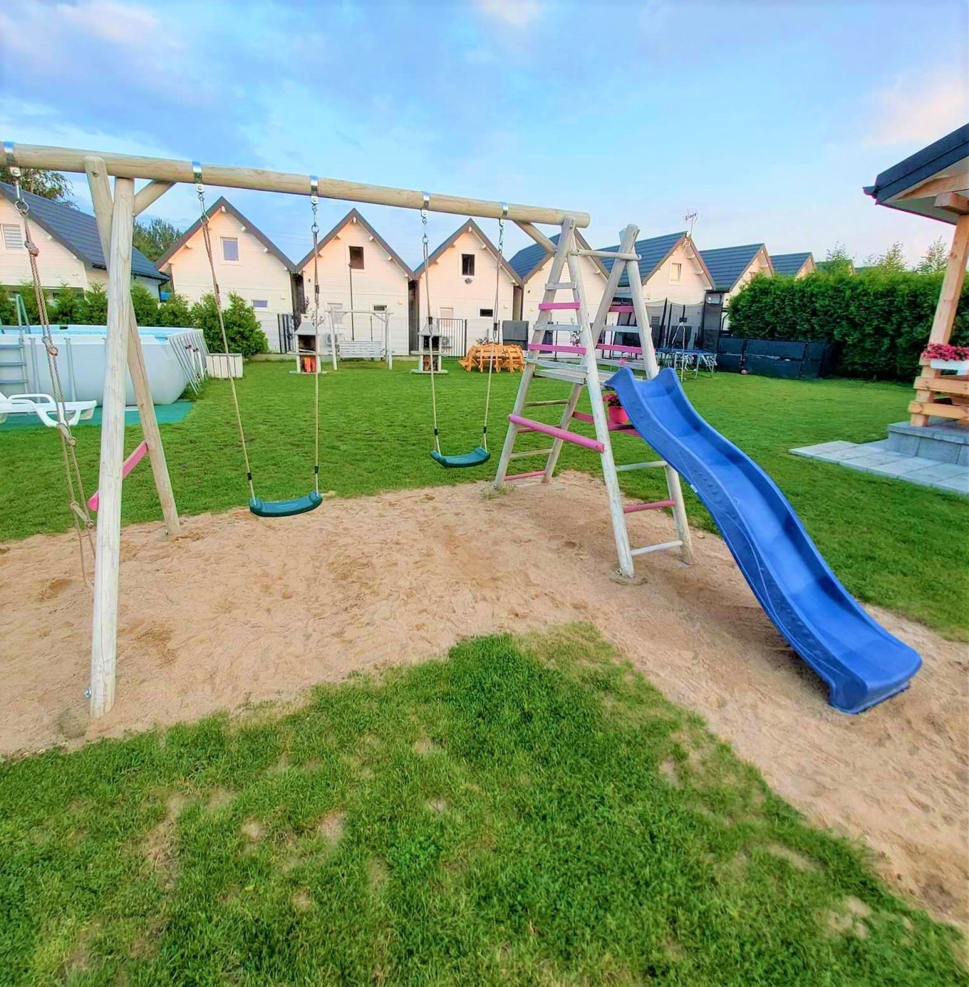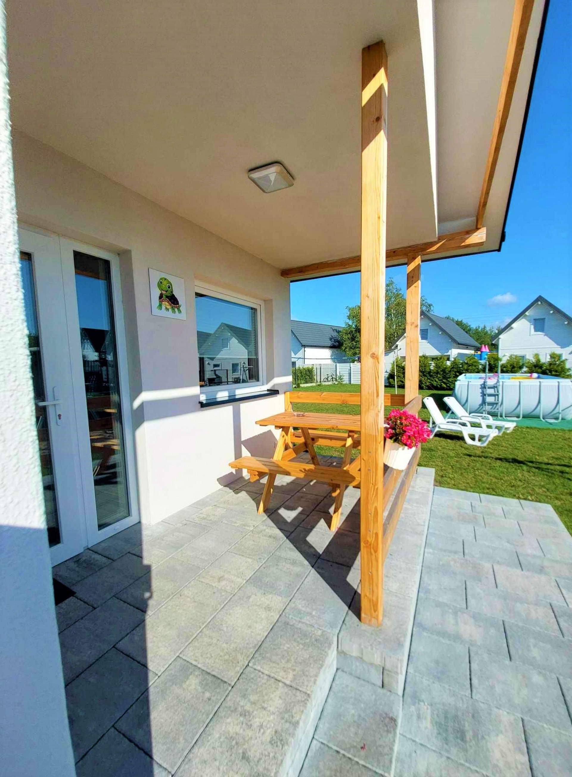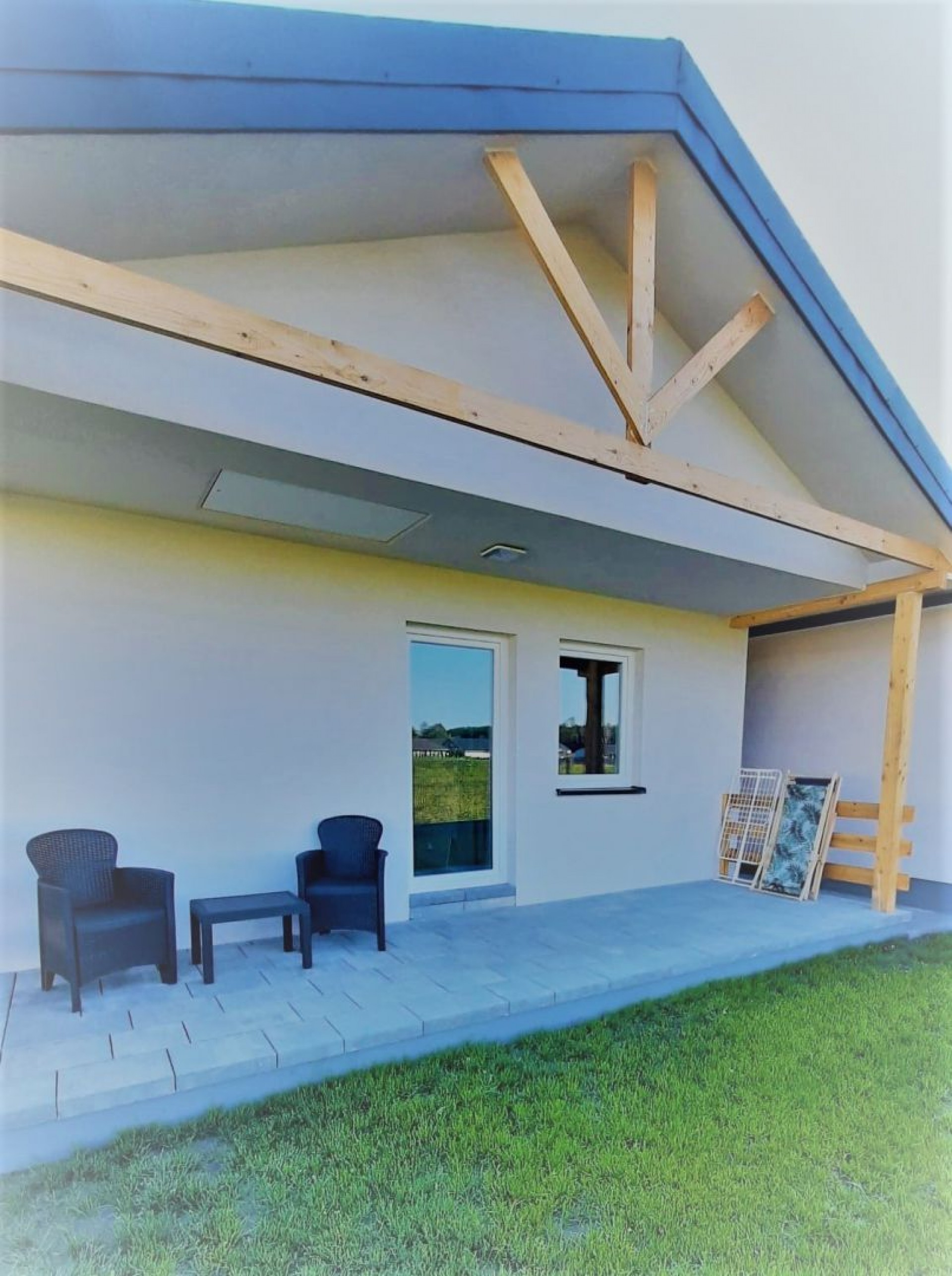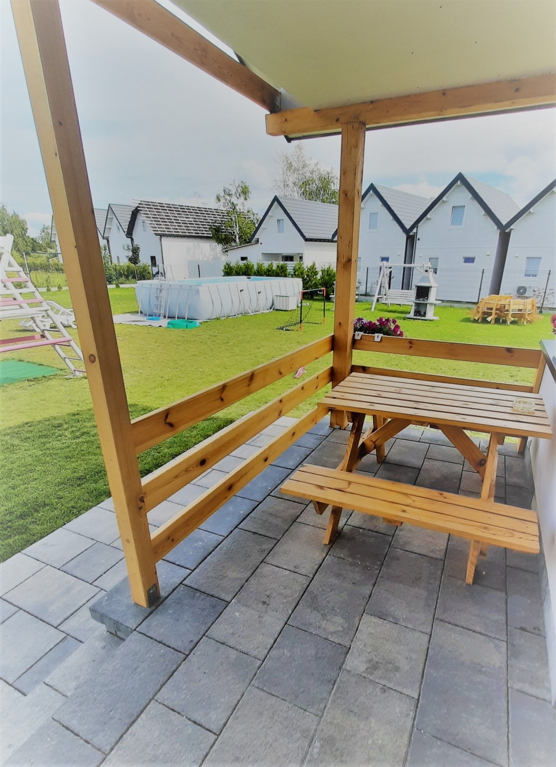 Do dyspozycji są dwa zadaszone tarasy. Wejściowy z widokiem na plac zabaw i obszerny teren oraz taras z drugiej strony domku z zejściem na ogródek.