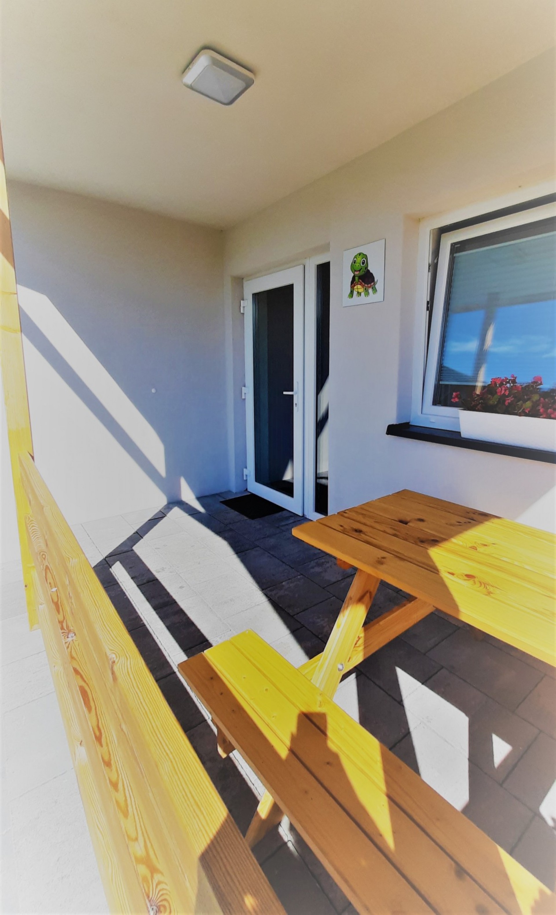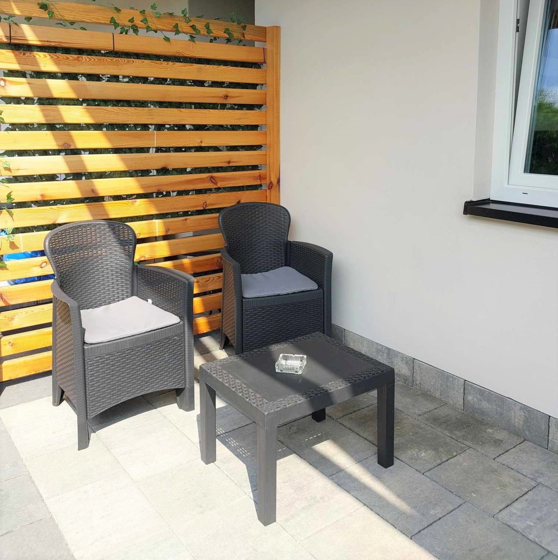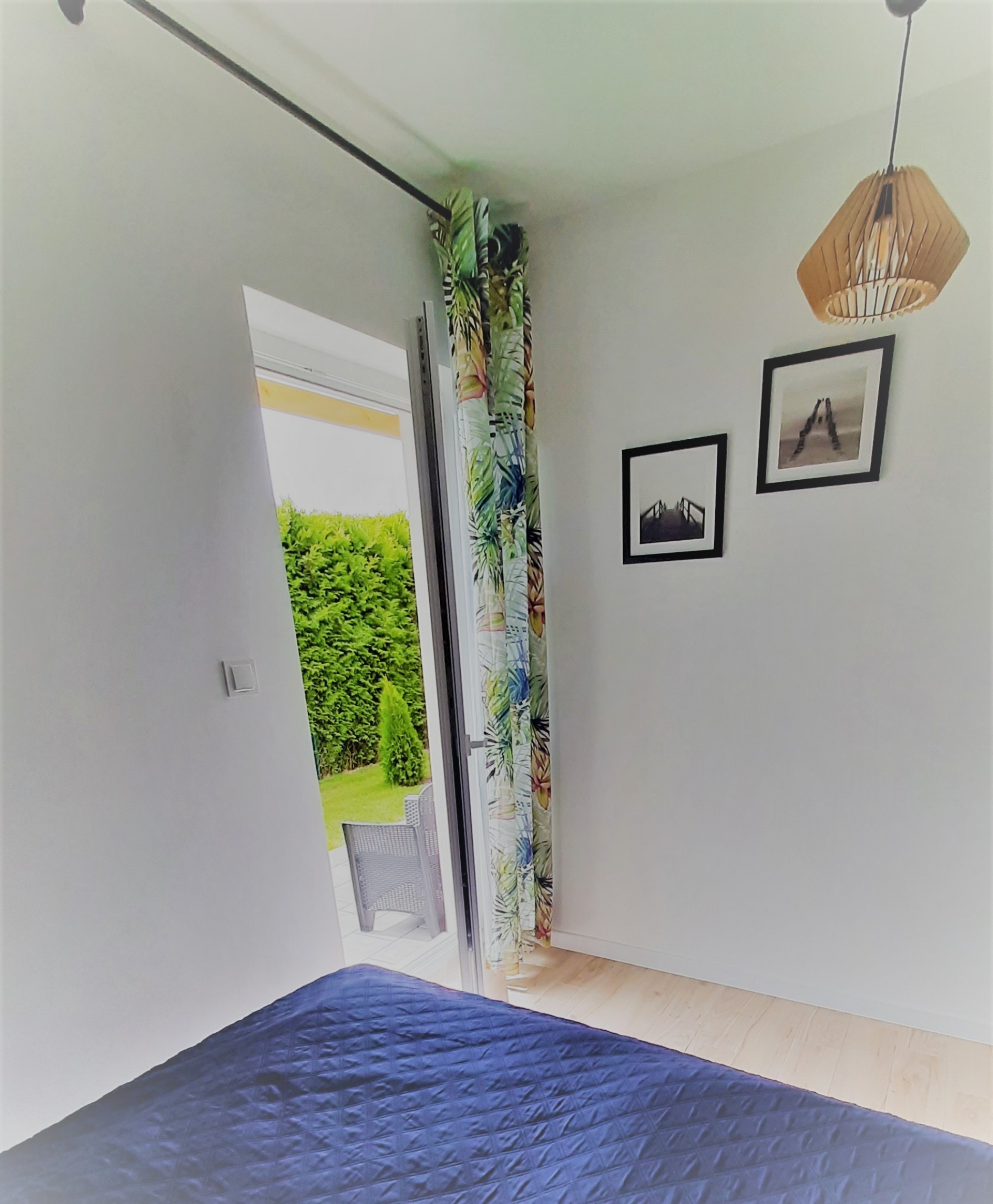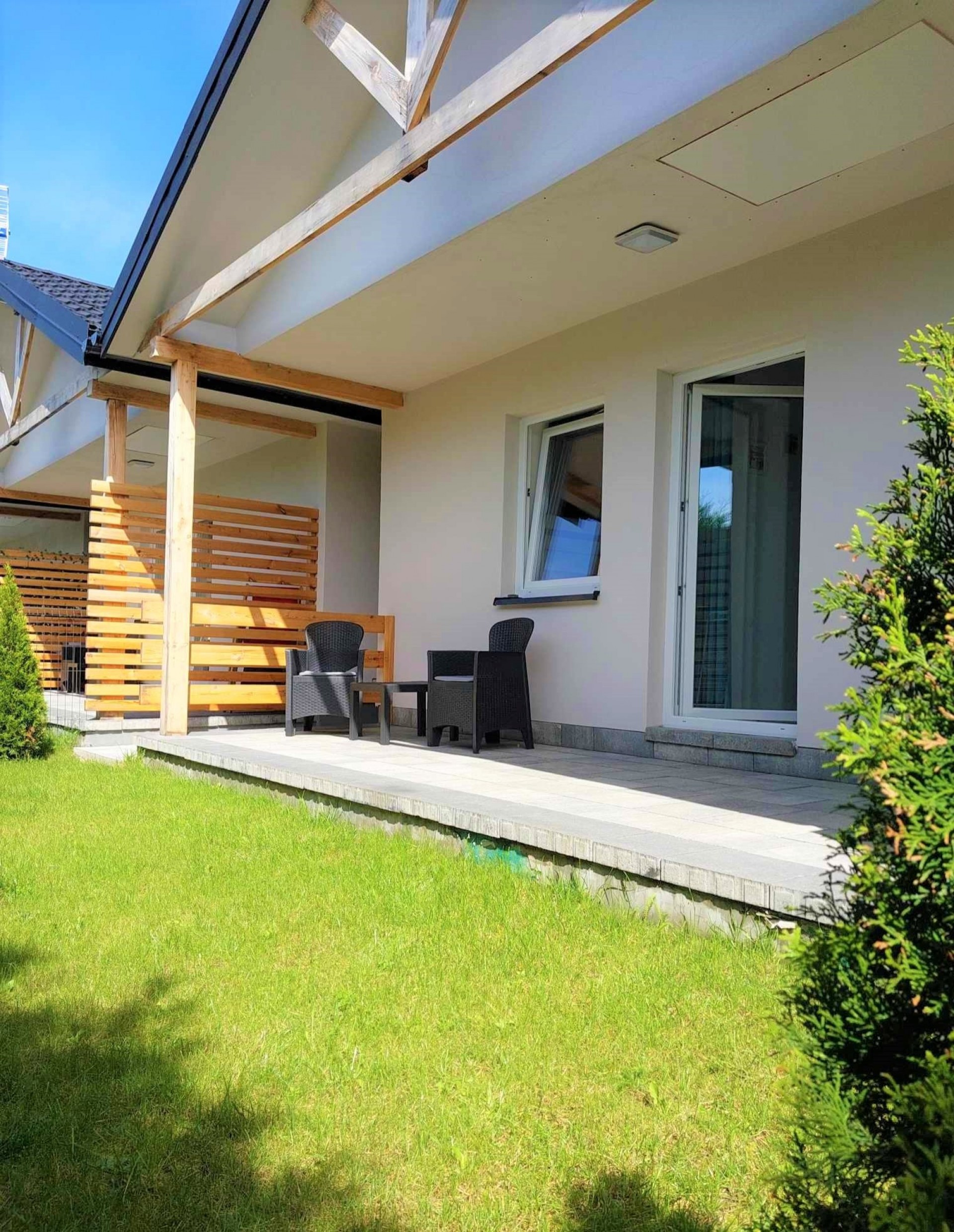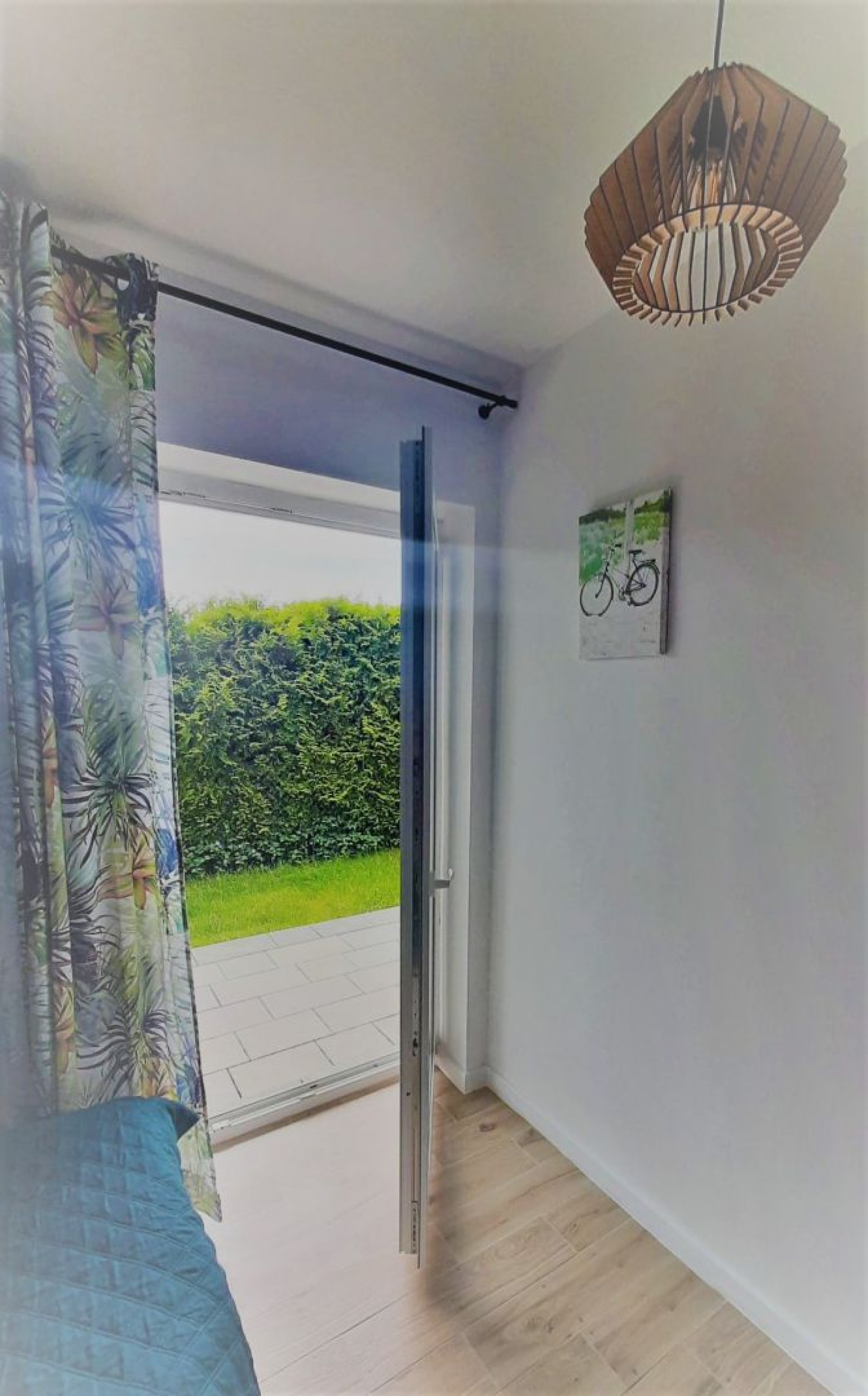 Do dyspozycji są dwa zadaszone tarasy. Wejściowy z widokiem na plac zabaw i obszerny teren oraz taras z drugiej strony domku z zejściem na ogródek.