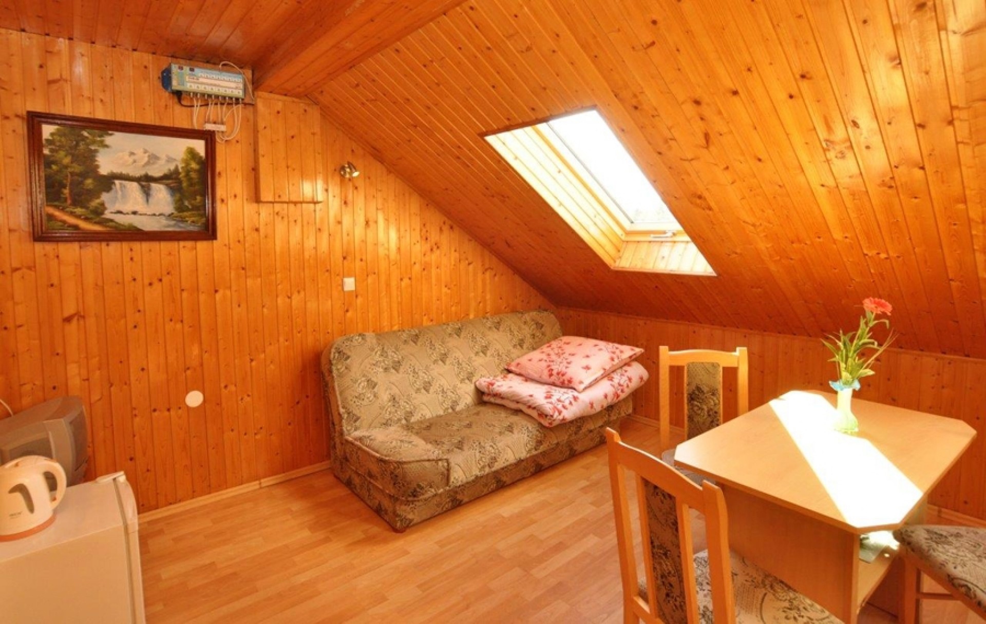 Domek składa się z tarasiku, łazienki, pokoju dziennego, sypialni i aneksu kuchennego z pełnym wyposażeniem. Trzy domki mają już kominki w których można napalić i wypić symboliczną lampkę wina w czarodziejskiej i romantycznej scenerii.