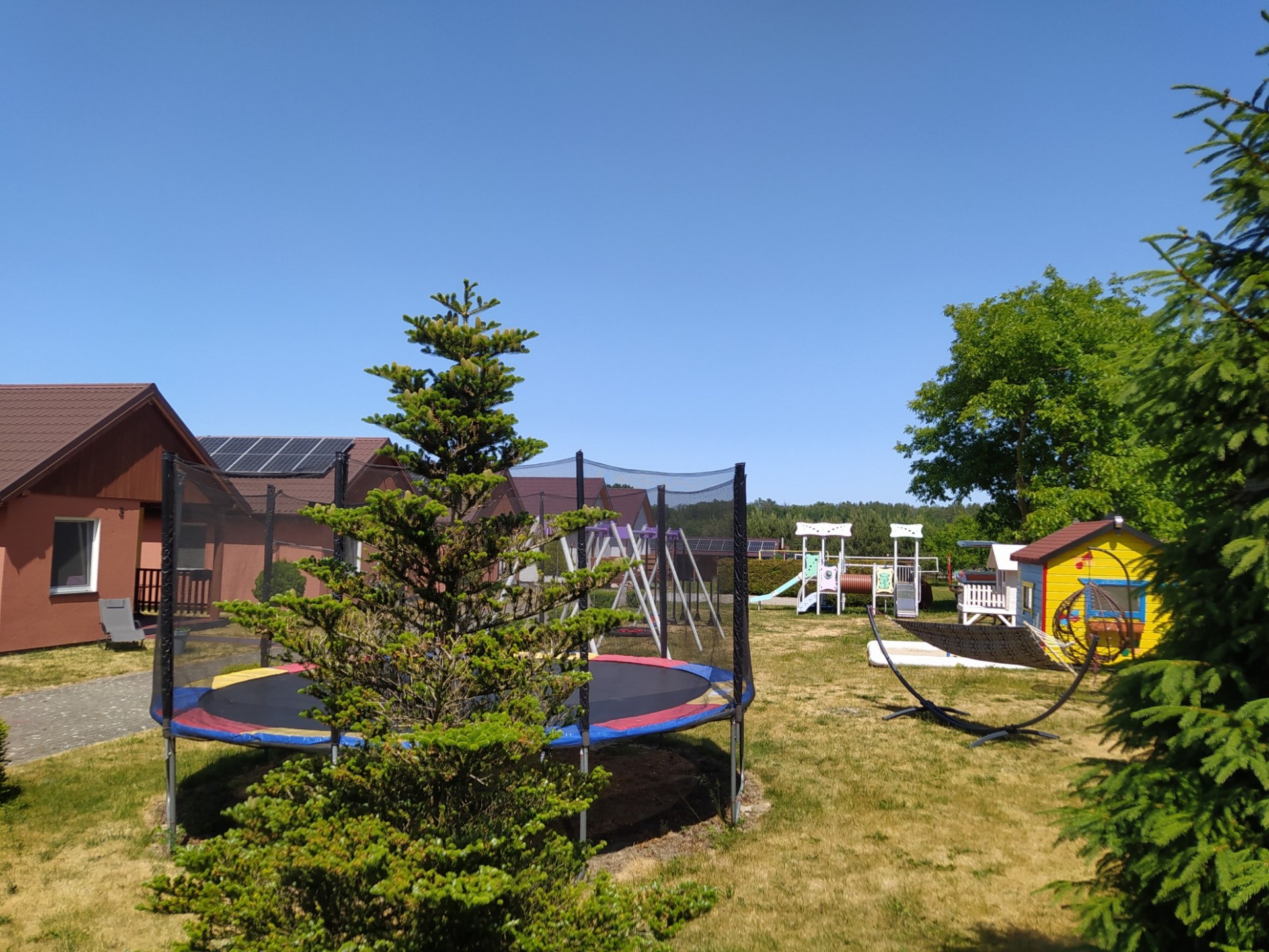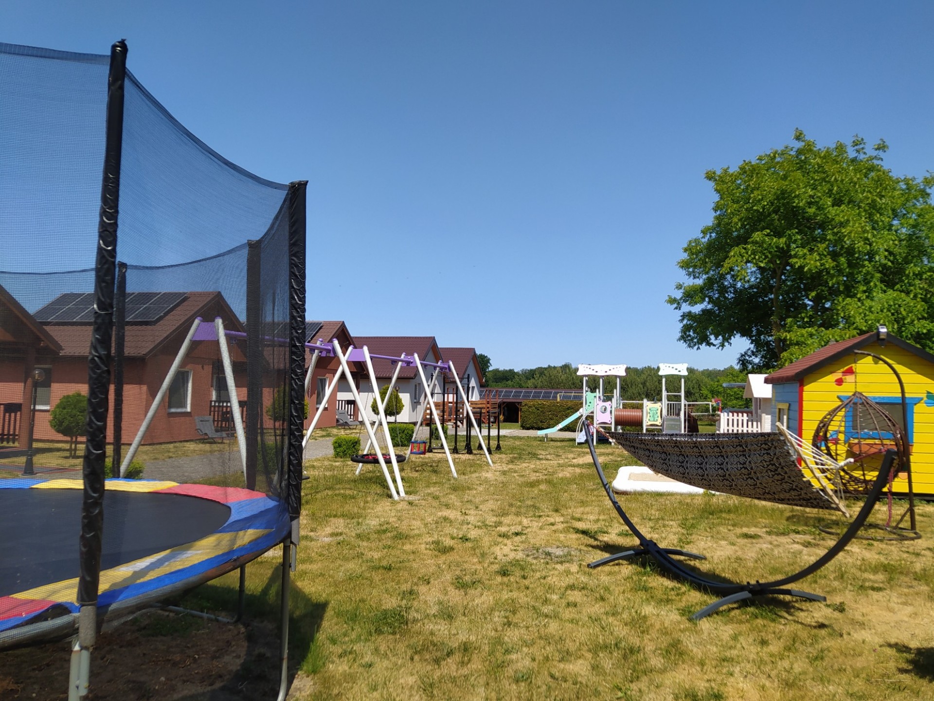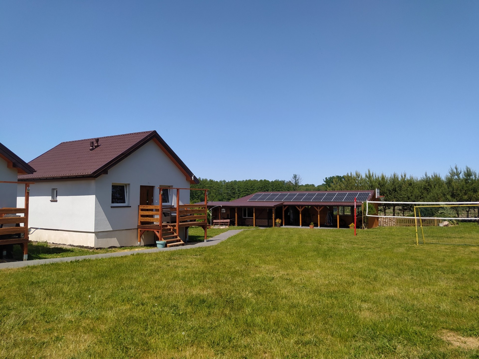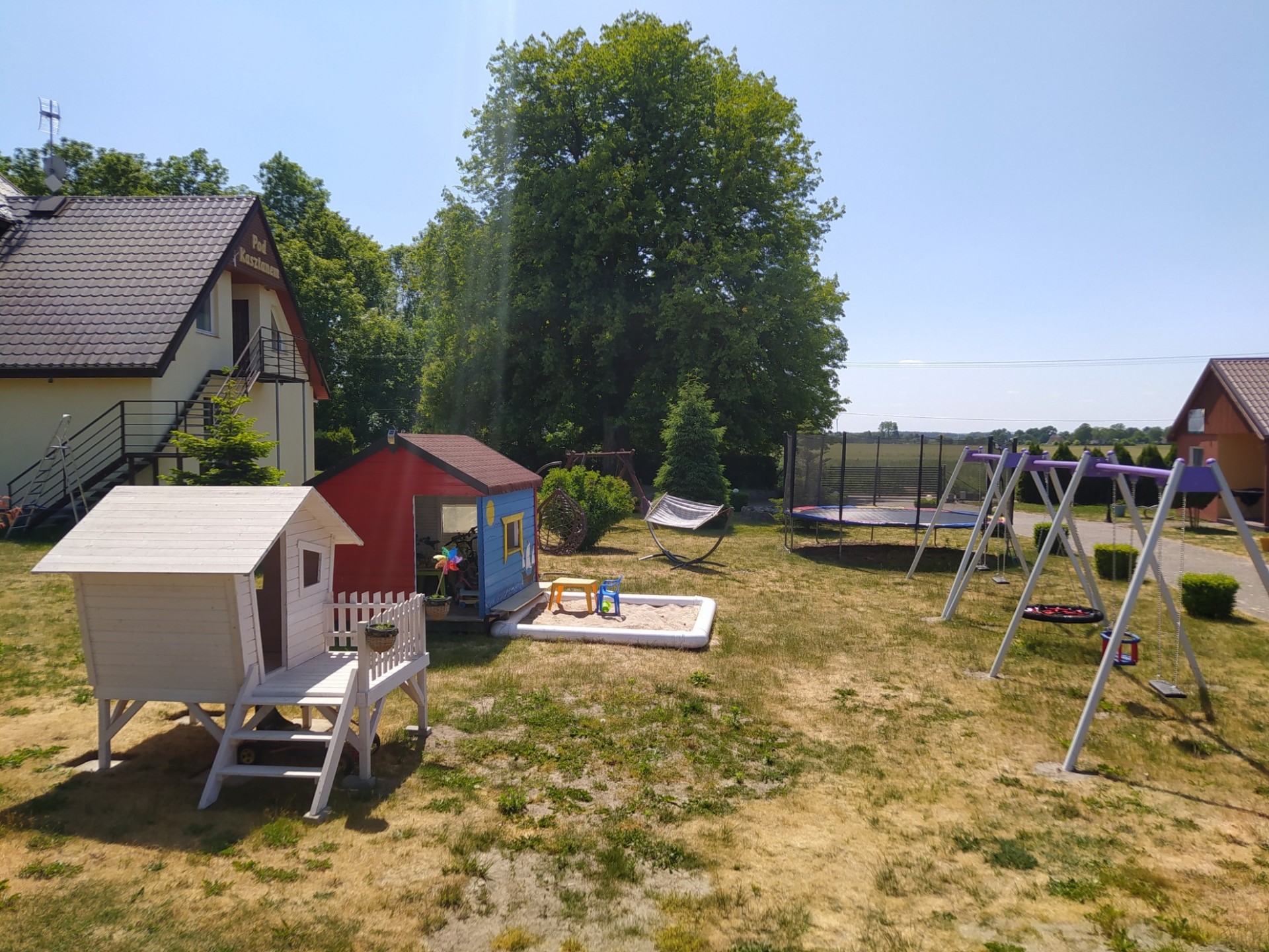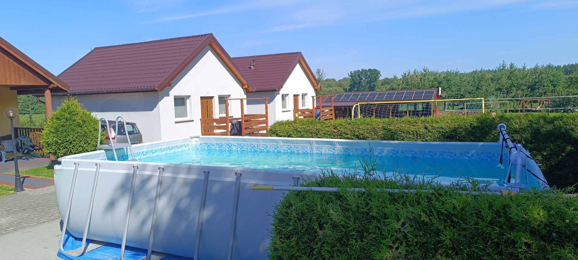 Dla dzieci plac zabaw z ogrodowym basenem, dla nieco starszych boisko do siatkówki.