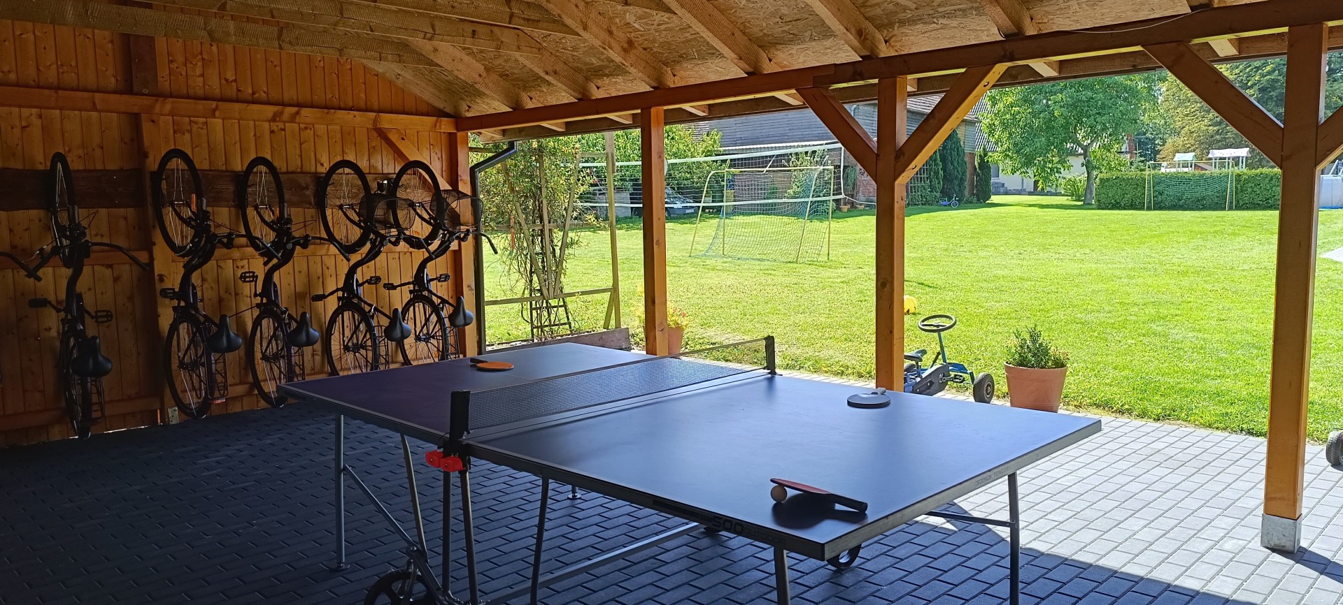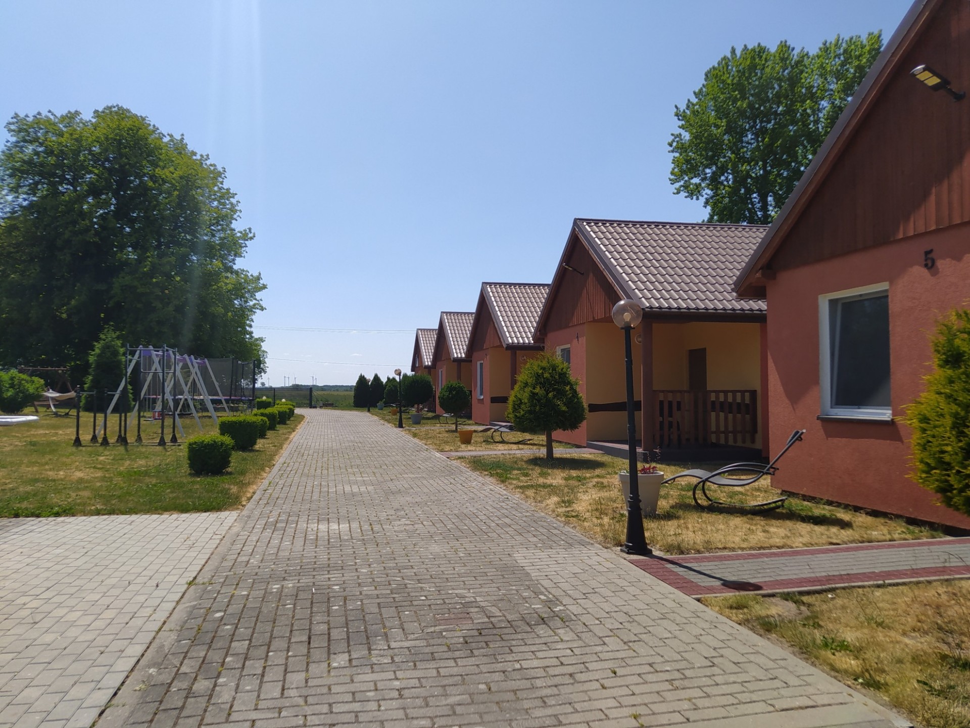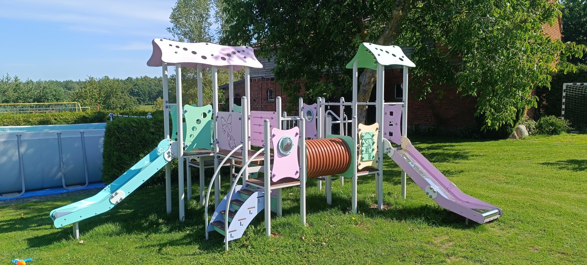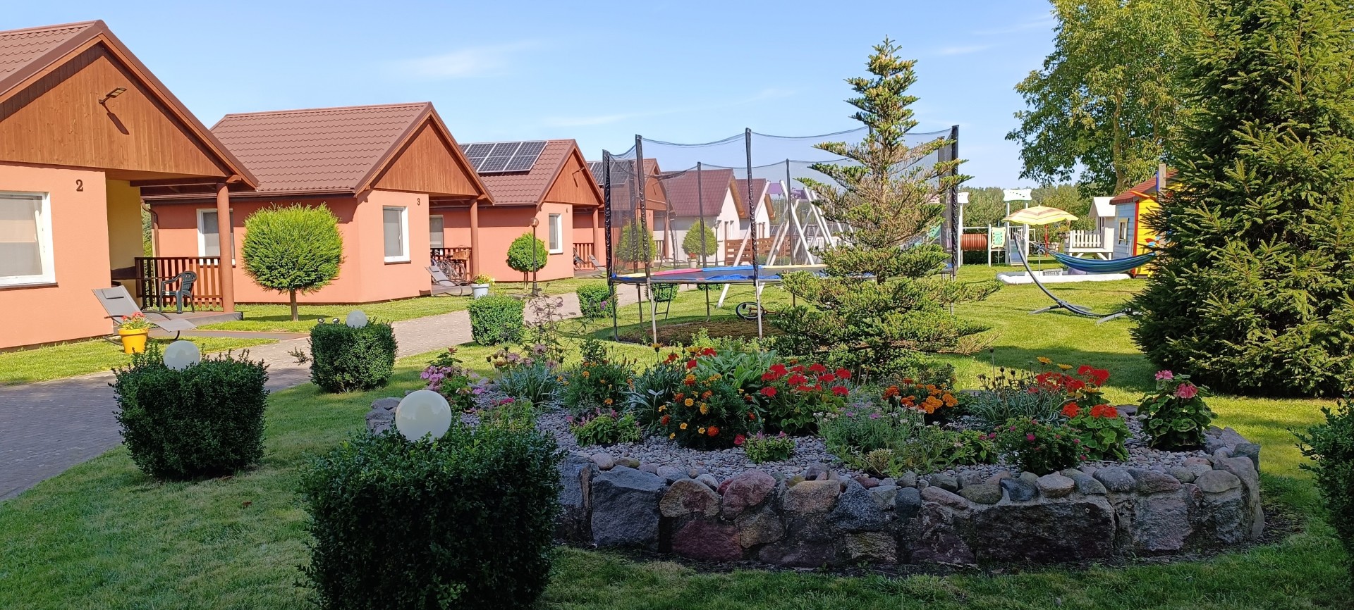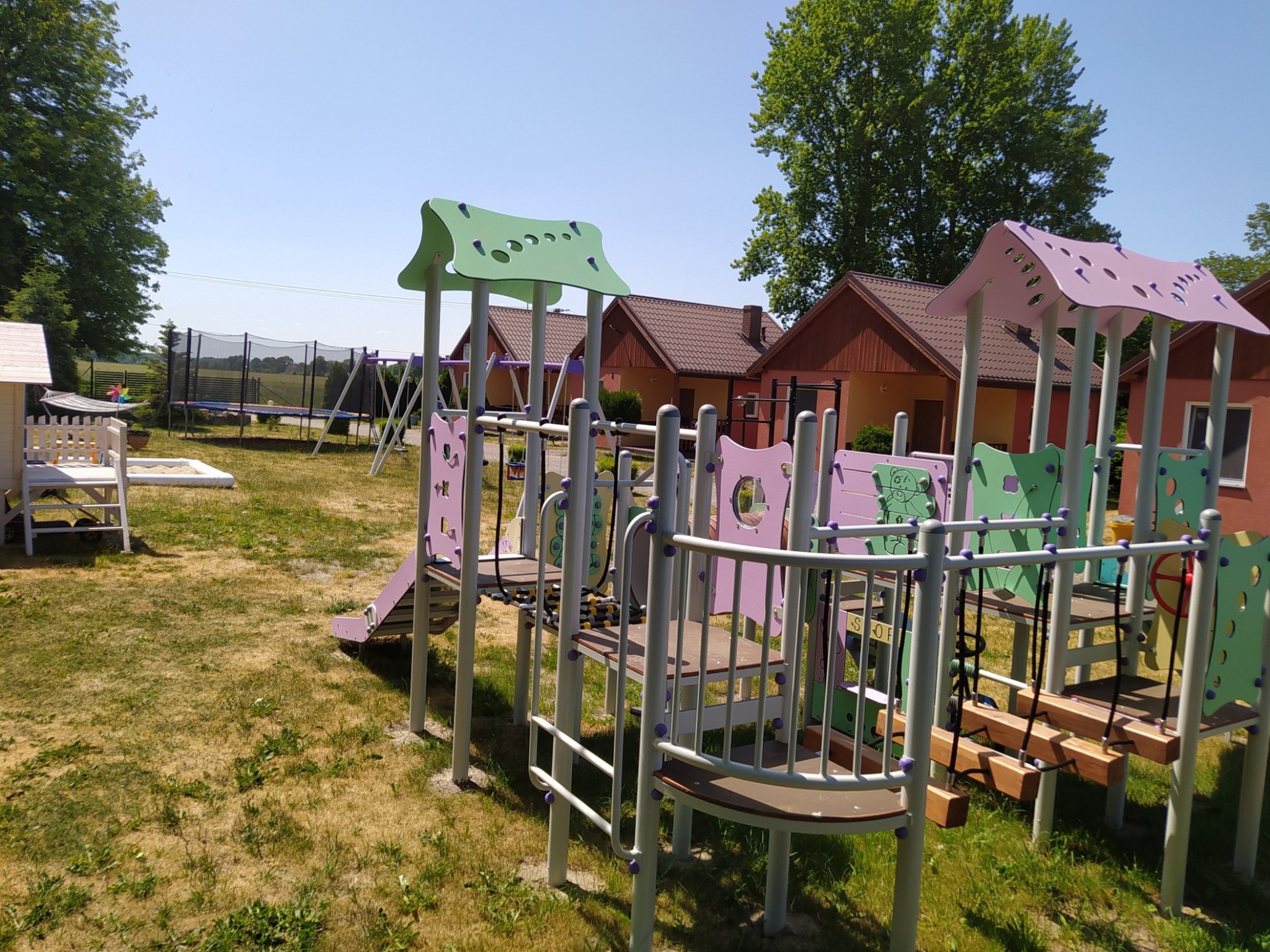 Dla dzieci plac zabaw z ogrodowym basenem, dla nieco starszych boisko do siatkówki.