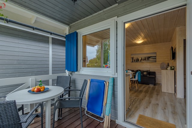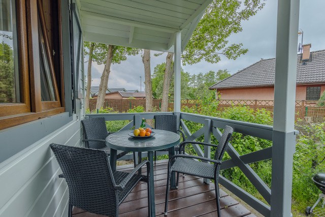 • taras – zadaszony i oświetlony, wyposażony w meble ogrodowe, grill, dwa leżaki oraz parawan plażowy.