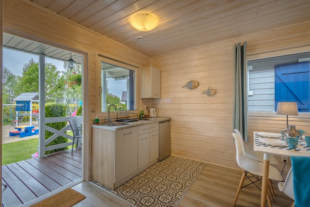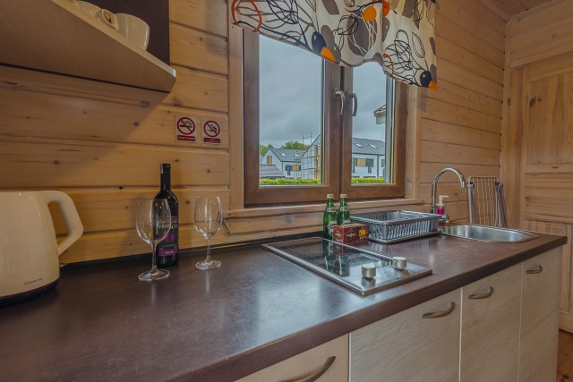 • kuchnia – w pełni wyposażona: zabudowa kuchenna, stół, krzesła, płyta ceramiczna, lodówka z zamrażalnikiem, czajnik elektryczny, opiekacz do kanapek, komplet naczyń, kieliszki, szklanki, kubki, sztućce, garnki, miseczki, noże i akcesoria kuchenne,