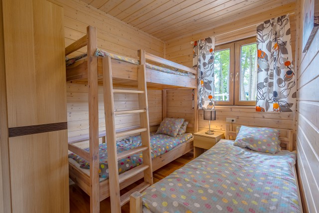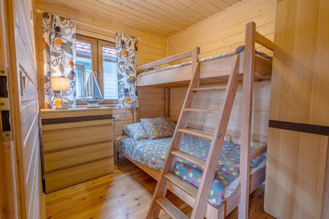 • sypialnia 2 – łóżko piętrowe z podwójnym miejscem na dole, komoda i lampka nocna.