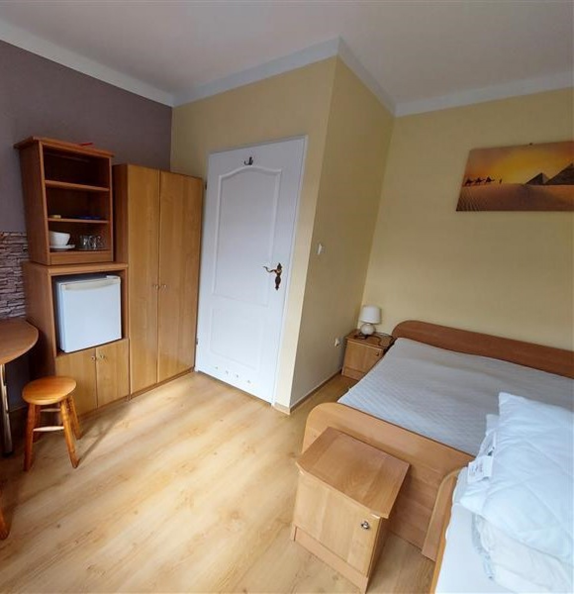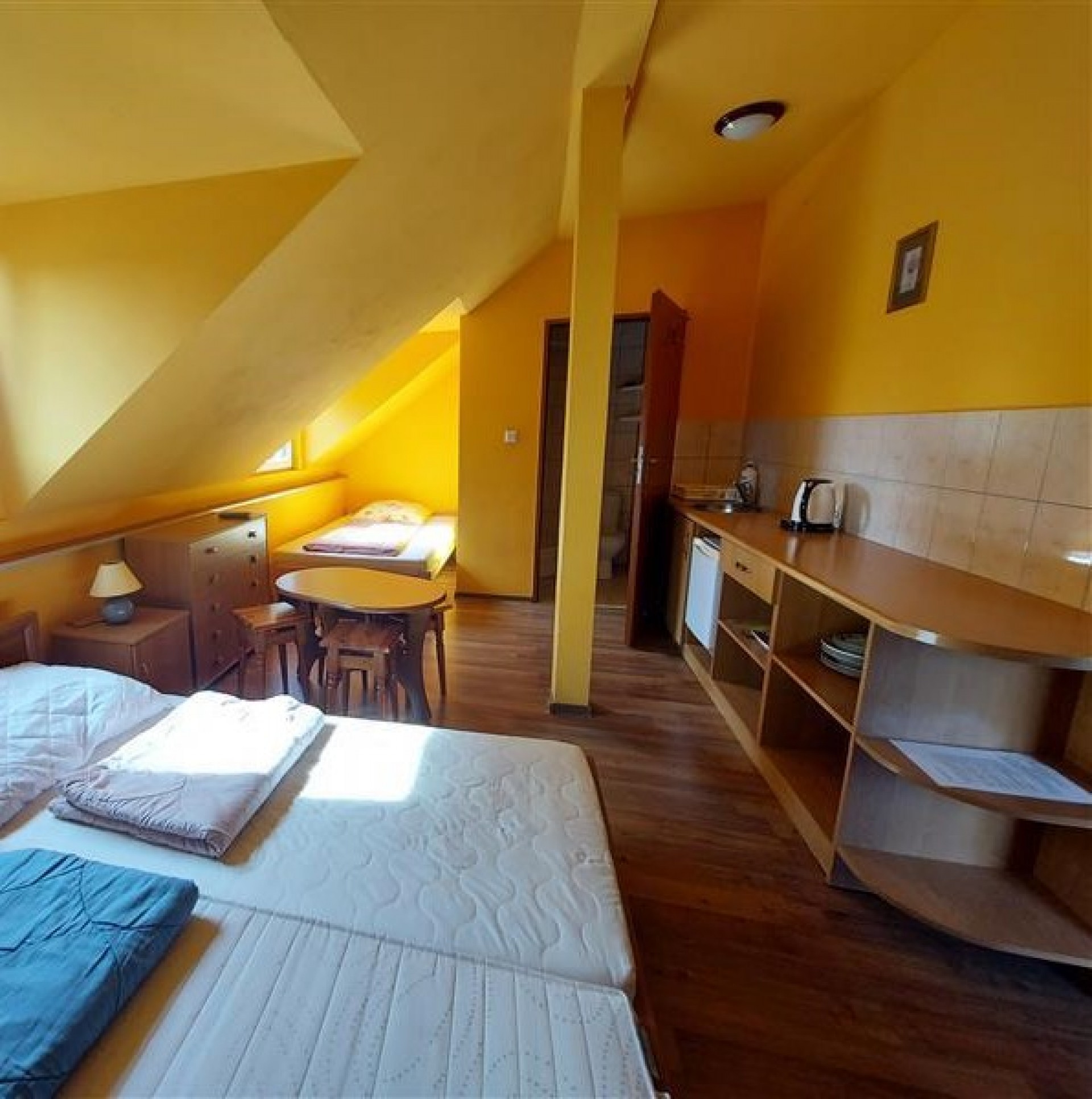 Posiadamy pokoje 2, 3, 4 osobowe z łazienkami oraz pełnym wyposażeniem: czajnik, sztućce, naczynia, TV, lodówka. W pokoju dodatkowo znajduje się parawan oraz koc.