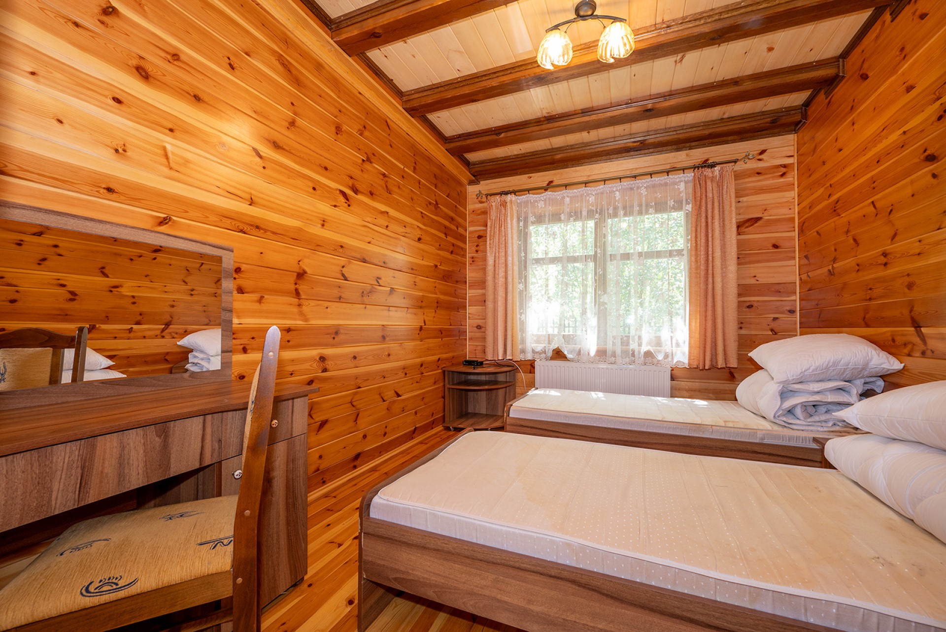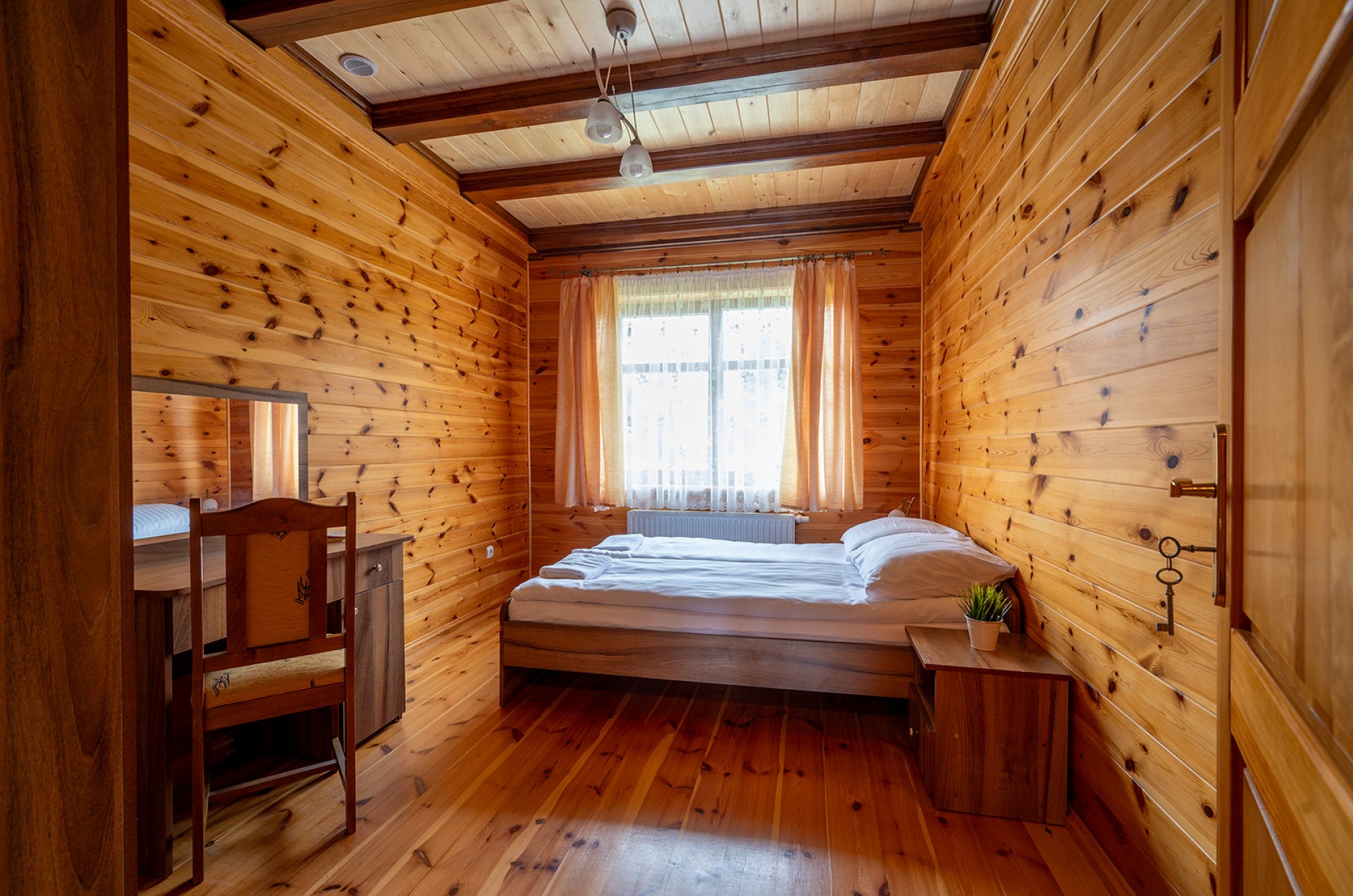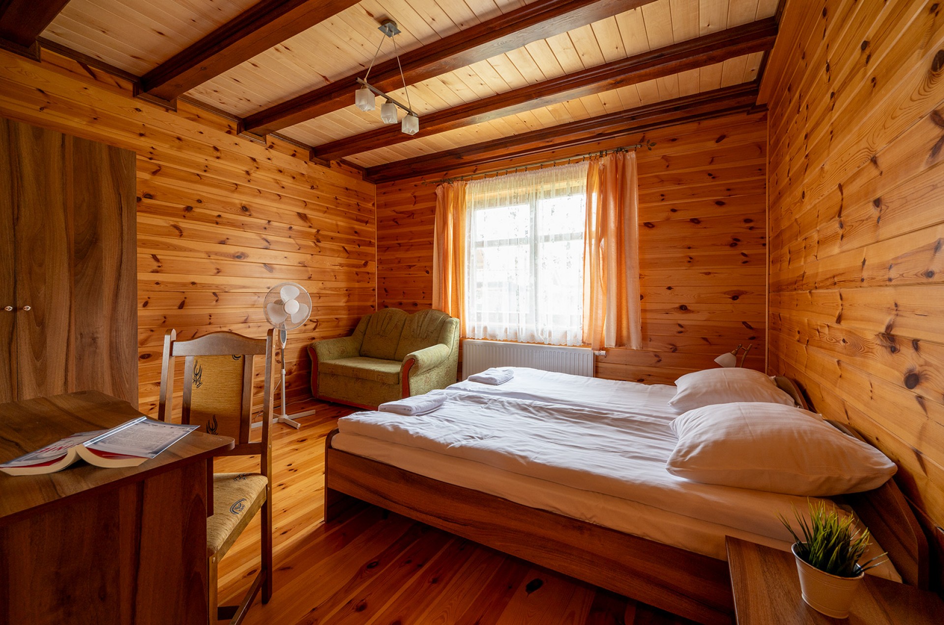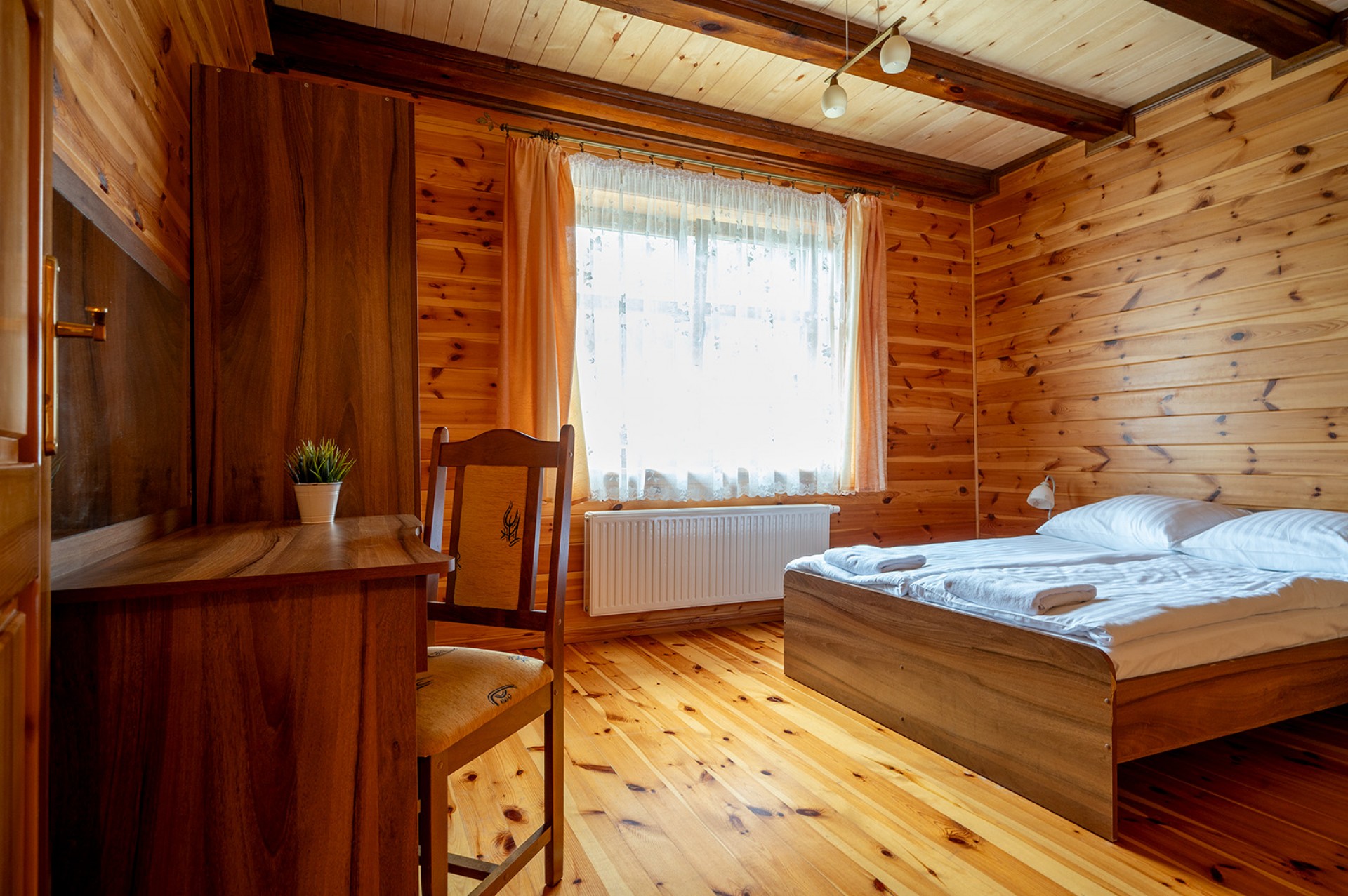 W ofercie Gościńca komfortowe pokoje 2, 3 osobowe, studio oraz 3 duże domy drewniane.