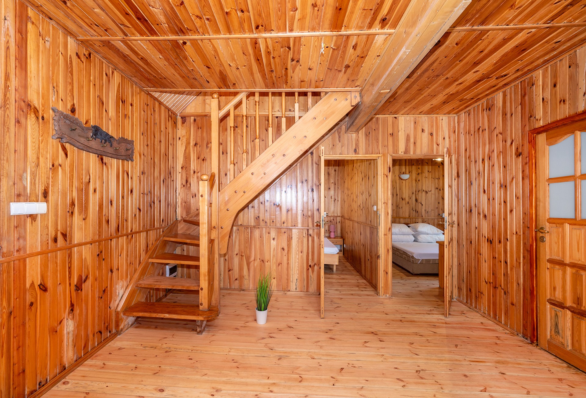 Na parterze znajdują się dwie sypialnie dwuosobowe (łoża małżeńskie, łazienka (prysznic, wc, umywalka) oraz salon z aneksem kuchennym. Na pierwszym piętrze znajdują się natomiast dwie sypialnie dwuosobowe. Każda z sypialni posiada po dwa jednoosobowe tapczany. Dodatkowo na pierwszym piętrze znajduje się również łazienka z wc i umywalką.