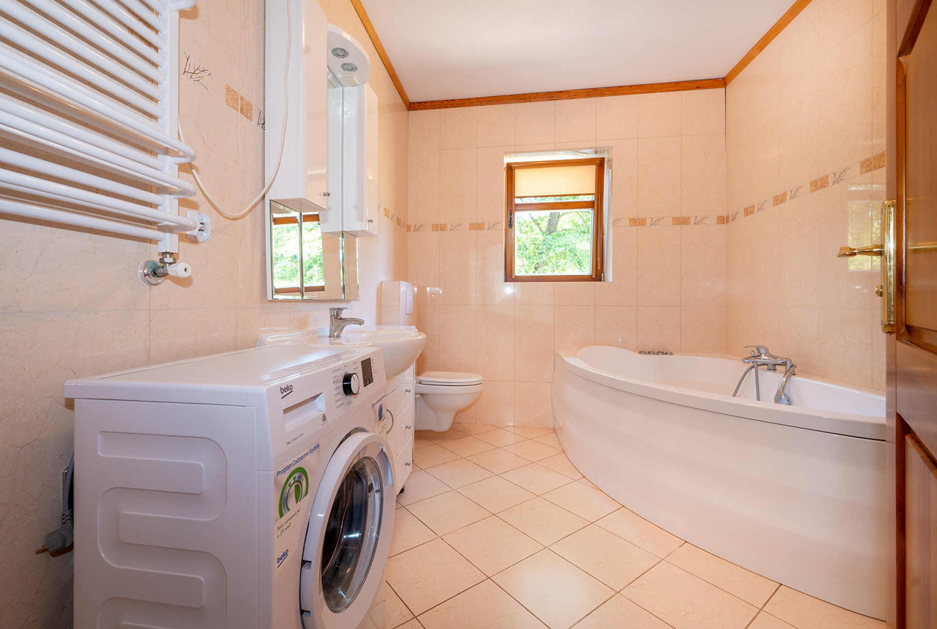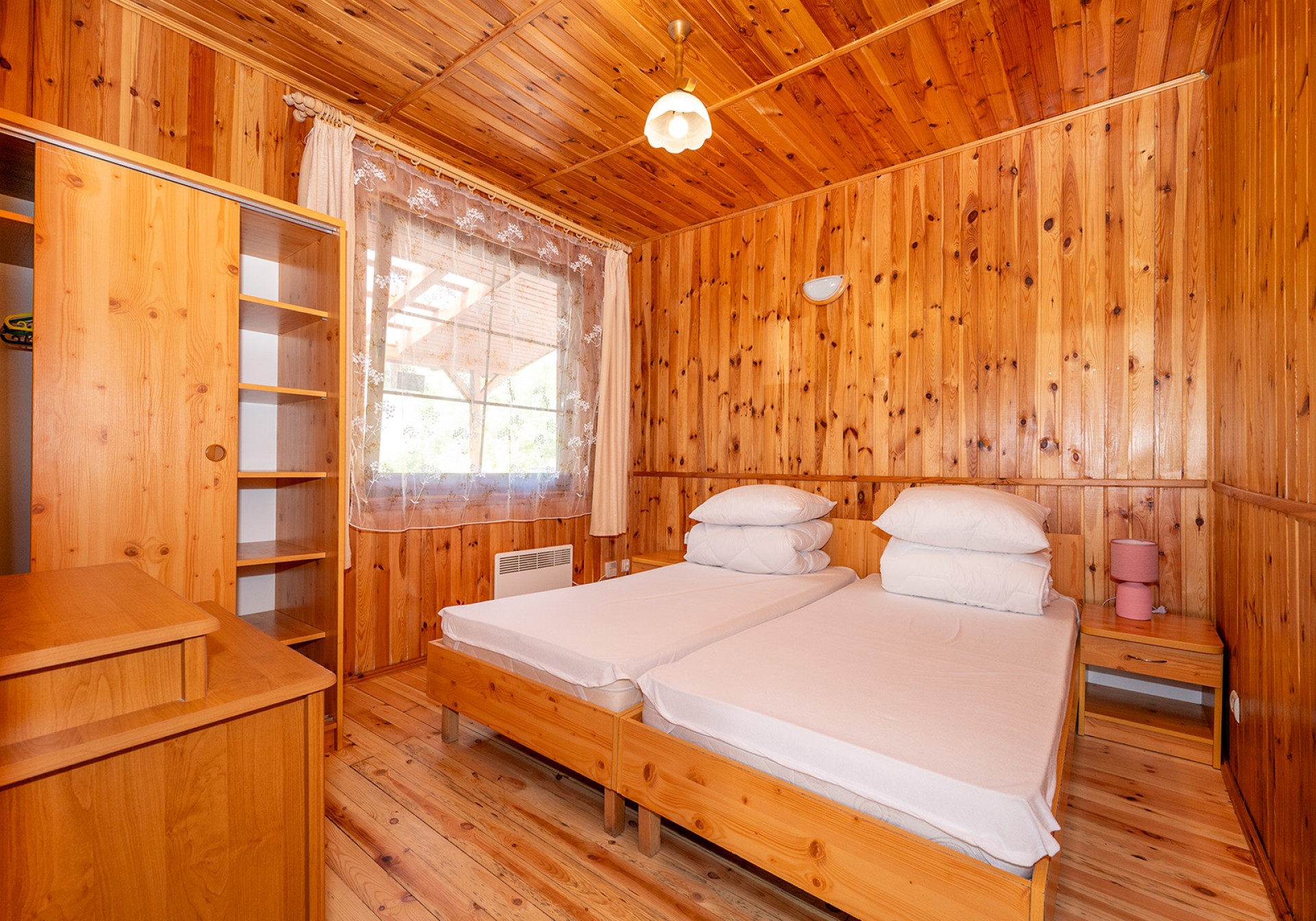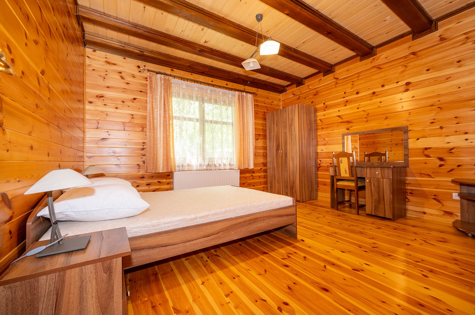 Domki posiadają 3 sypialnie dwuosobowe, 2 łazienki, salon, kuchnię, przedpokój oraz taras. Każda z sypialni oraz salon wyposażone są w telewizor. Jedna łazienka posiada prysznic umywalkę oraz ubikację, druga prysznic i wannę z hydromasażem, ubikację oraz umywalkę. W salonie znajduje się kominek.